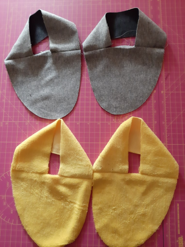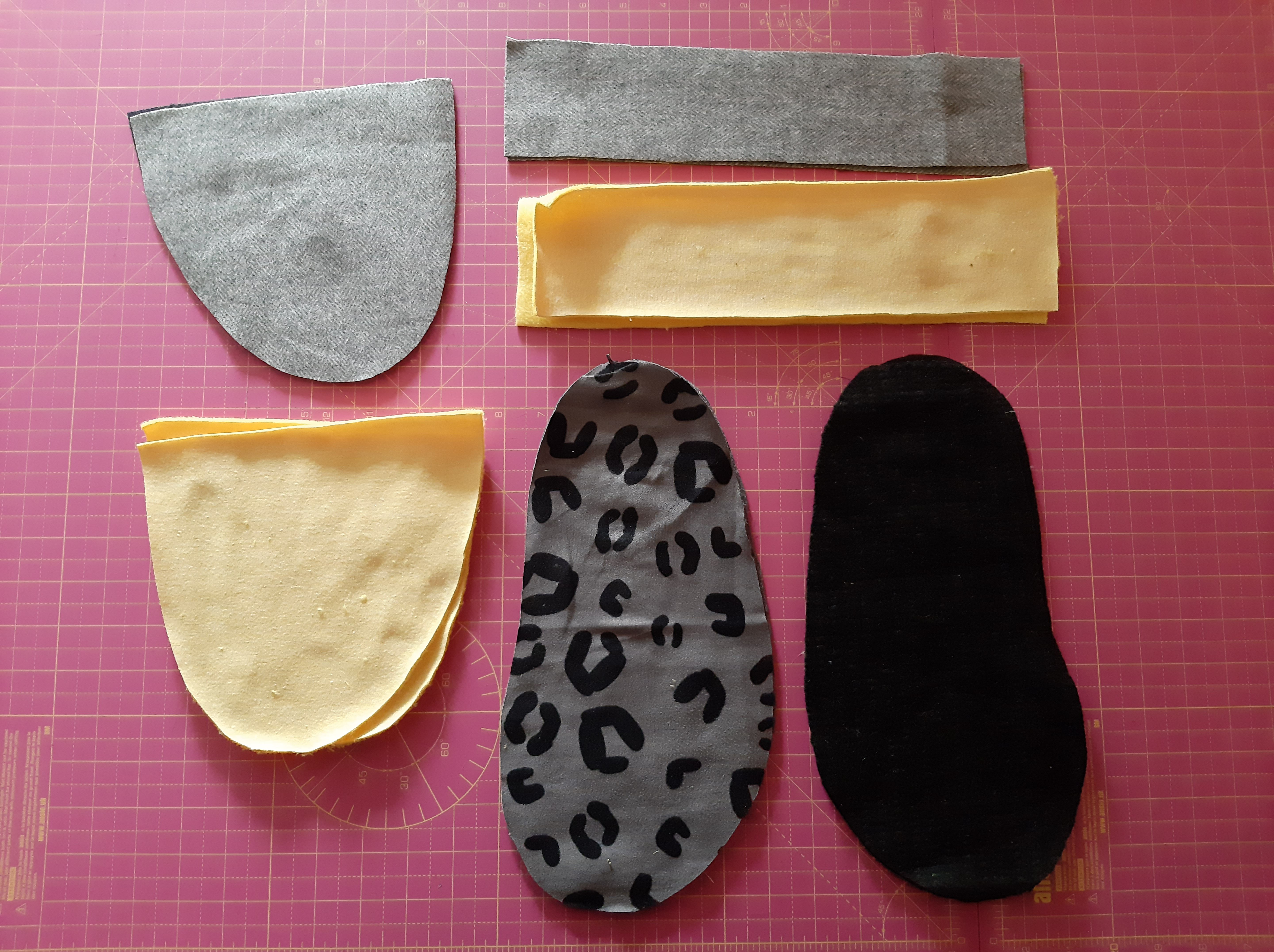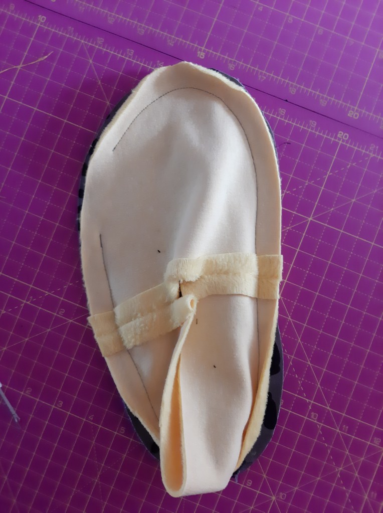 Cut one in fabric, one in lining fabric. Remember to cut the heel lining piece 0.5cm higher than the main fabric piece to allow for the elastic channel