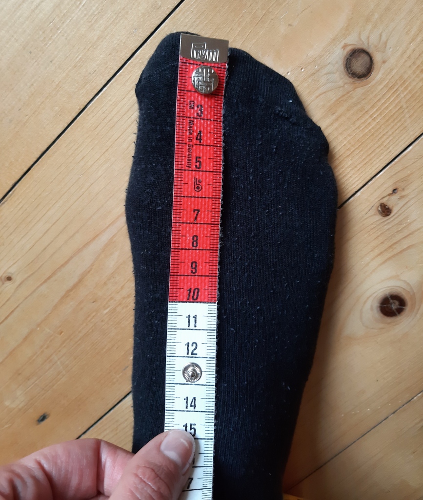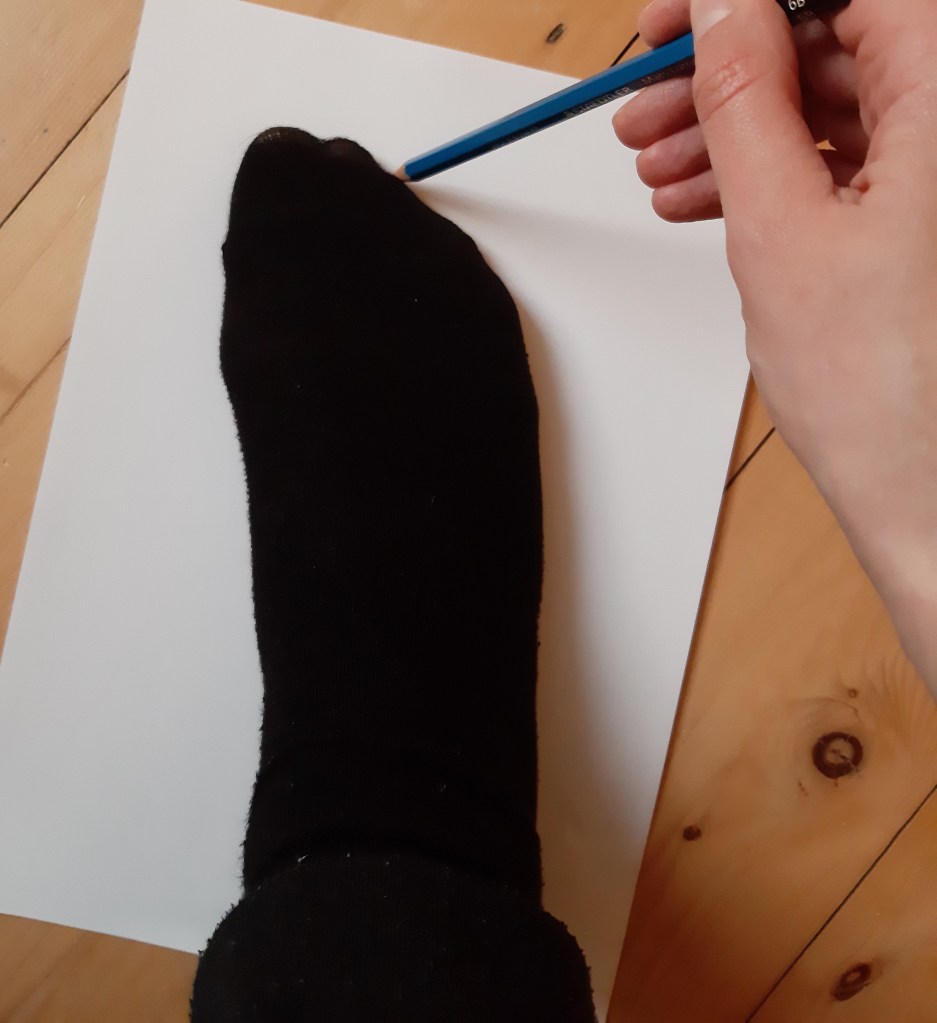 4. Now create the upper front pattern piece. Using a tape measure, measure from the tip of your toe to a comfortable spot about 1” lower than the ankle and include a 1.5cm seam allowance. On my foot, this was 14cm.