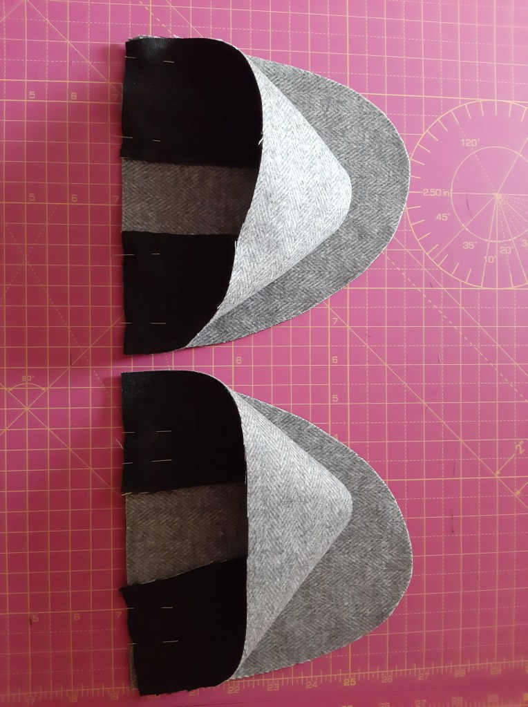 1. Using the main fabric, first pin the short ends of the heel piece to the square end of the upper front piece, RST.
