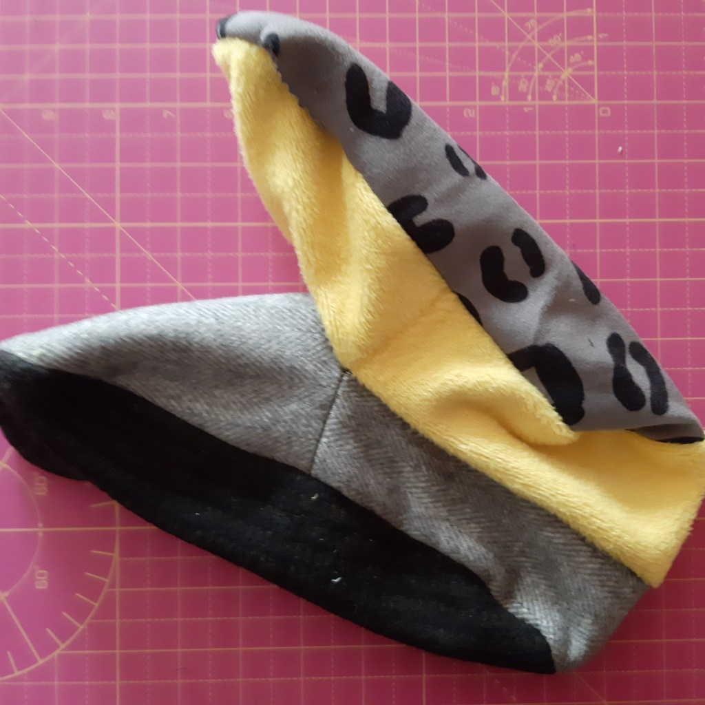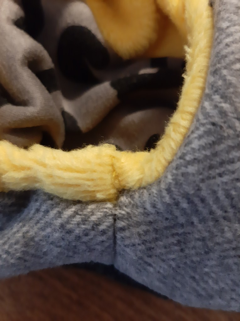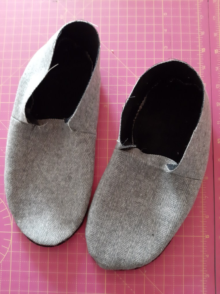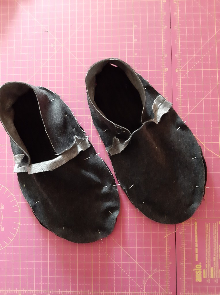 8. Turn right way out, by pulling the slipper through the turning gap. Tuck the lining back inside the outer, wrong sides facing, and try on. Adjust fit if necessary: if using a bulky fabric, you may need to increase the seam allowances on the lining so it sits snugly inside. Once happy with the fit, trim seam allowances down (and make a note on your pattern piece for next time), turn the right way out again, and press. Do not slip stitch the turning gap yet!