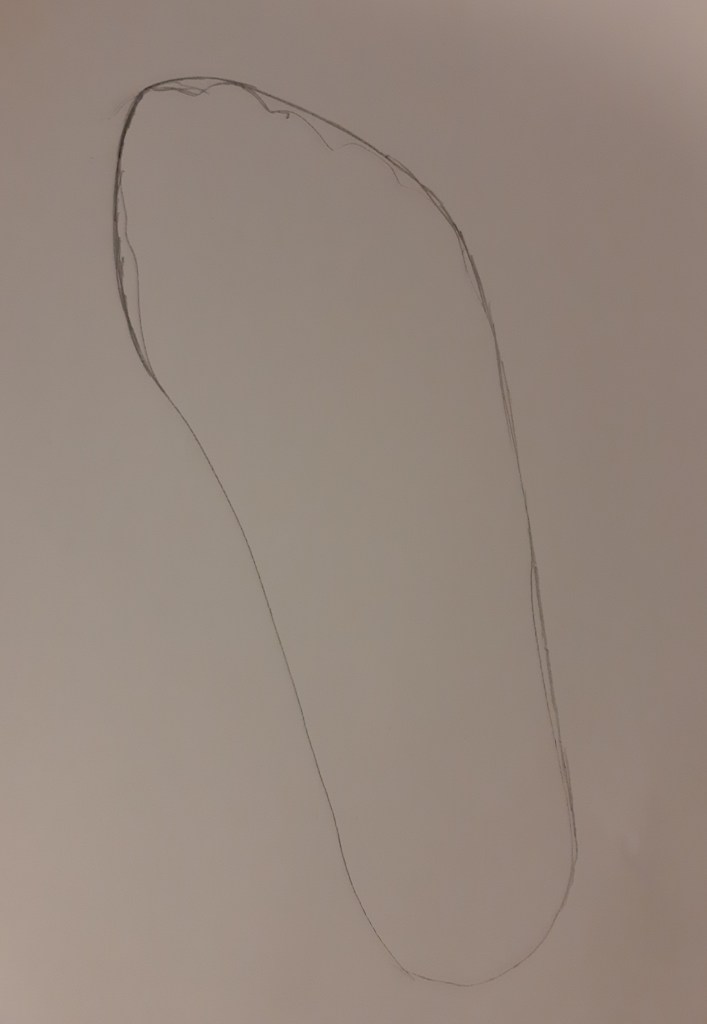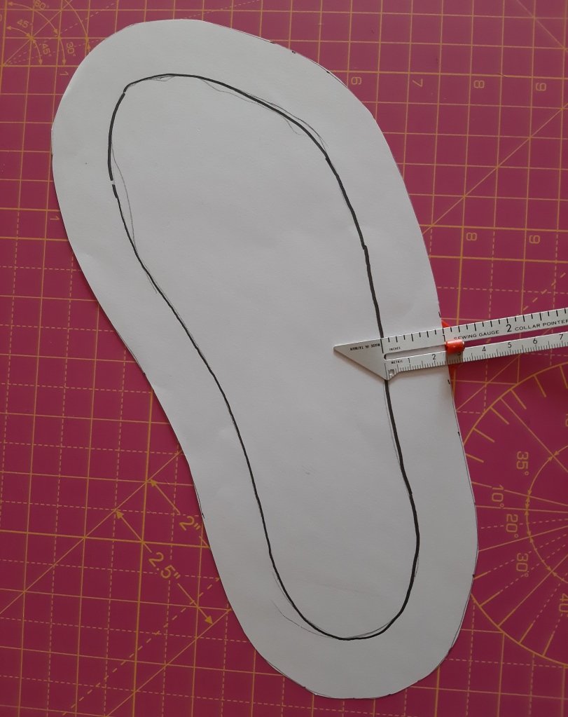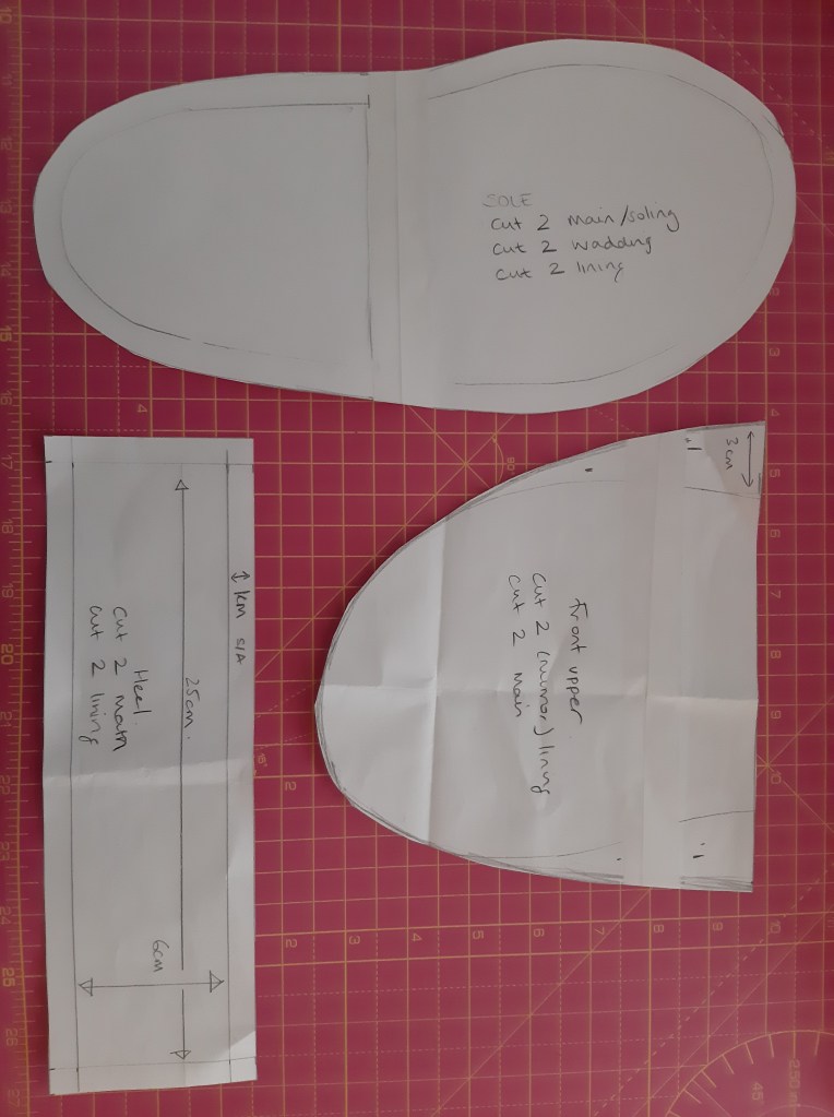 8. To make the heel piece, take a tape measure or bendy ruler and, on your sole pattern piece, measure the heel curve (not including the 1.5cm seam allowance) up to the line for the upper front. Taking the tape measure to your foot again, measure from the ground to under your ankle bone at a comfortable spot for your slipper to come to. For me, this was 6cm.