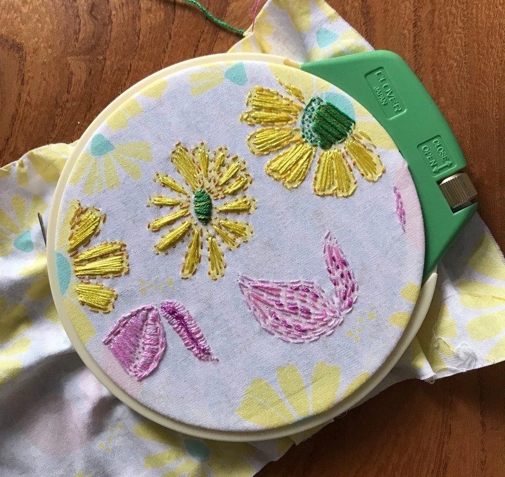I’m delighted to announce that the answer to both was yes. Yes, I managed to embroider a few of the flowers within a couple of hours and I wasn’t displeased with the results. And yes, I really did enjoy the process. So much so, in fact, I found it quite hard to put it down to make dinner and chose the hoop over my usual bed time book.