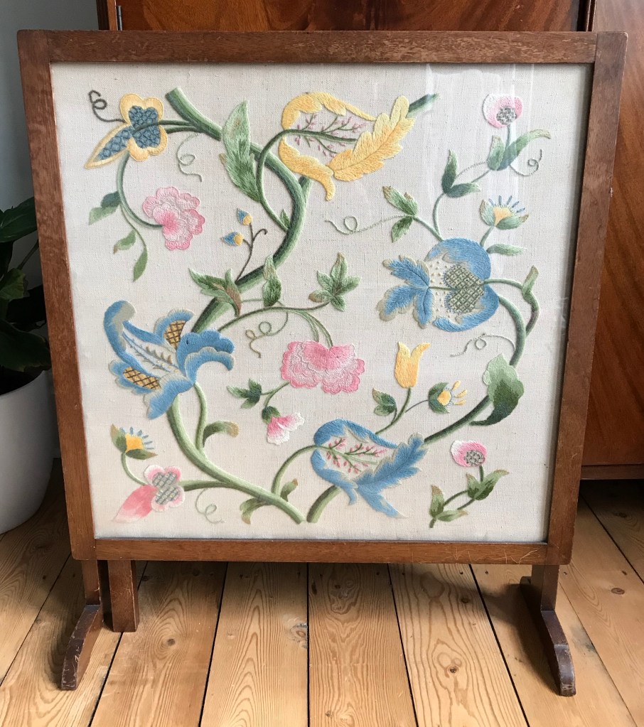 As I went to bed last night I stopped by the fire guard that sits in front of our bedroom fireplace. It’s a beautiful mid-century oak-framed glass-fronted guard and the picture is an abundance of beautifully ornate embroidered flowers. I’ve loved it ever since it came to us after my husband’s grandmother passed away some years ago, but this time I stopped and marvelled at just how magnificently talented she was.