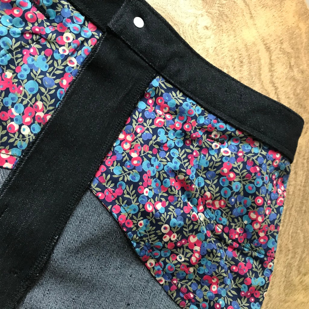 I’m not into the obsession with meticulously toiled and tested denim, but with a few tweaks for subsequent pairs, this has become the pattern I always turn to whenever a nice bit of denim crosses my path. The neat detailing around the pockets means beautiful cotton lawn remnants get a look in too.