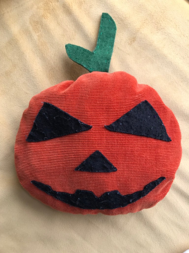 3. For the pumpkin, cut out two larger triangles in black felt for the eyes, and one smaller triangle for the nose. Create a spooky toothy smile about 15cm wide and cut out in black felt. Draw the stalk and add 1cm for seam allowance (which will be hidden inside the cushion).