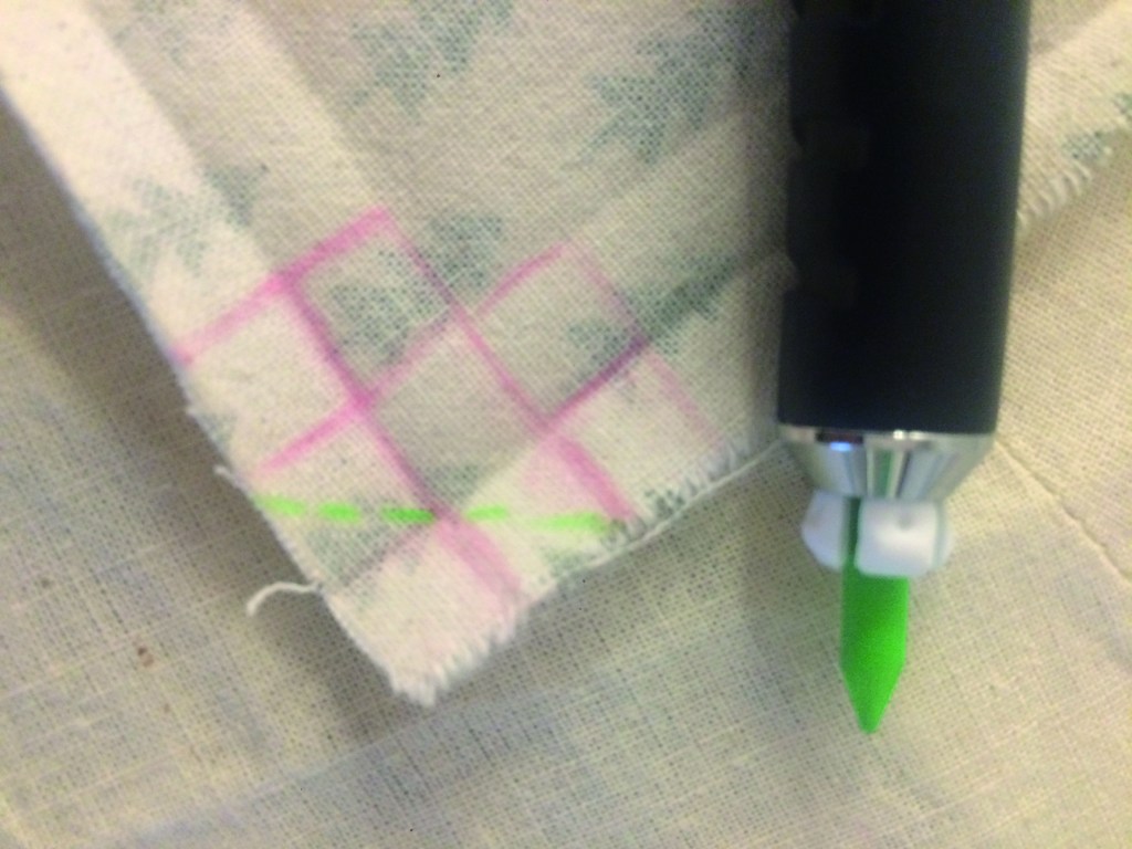 Using the pressing marks (in pink) as a guide, mark the diagonal line across the tip of the corner, spanning the outer folds (in green).