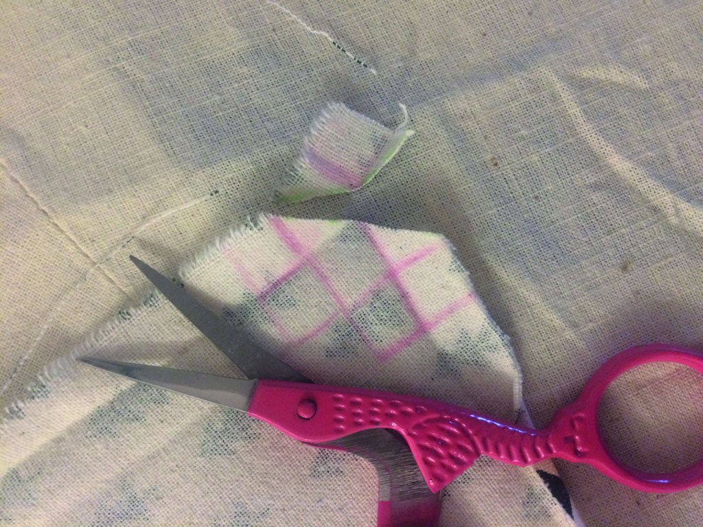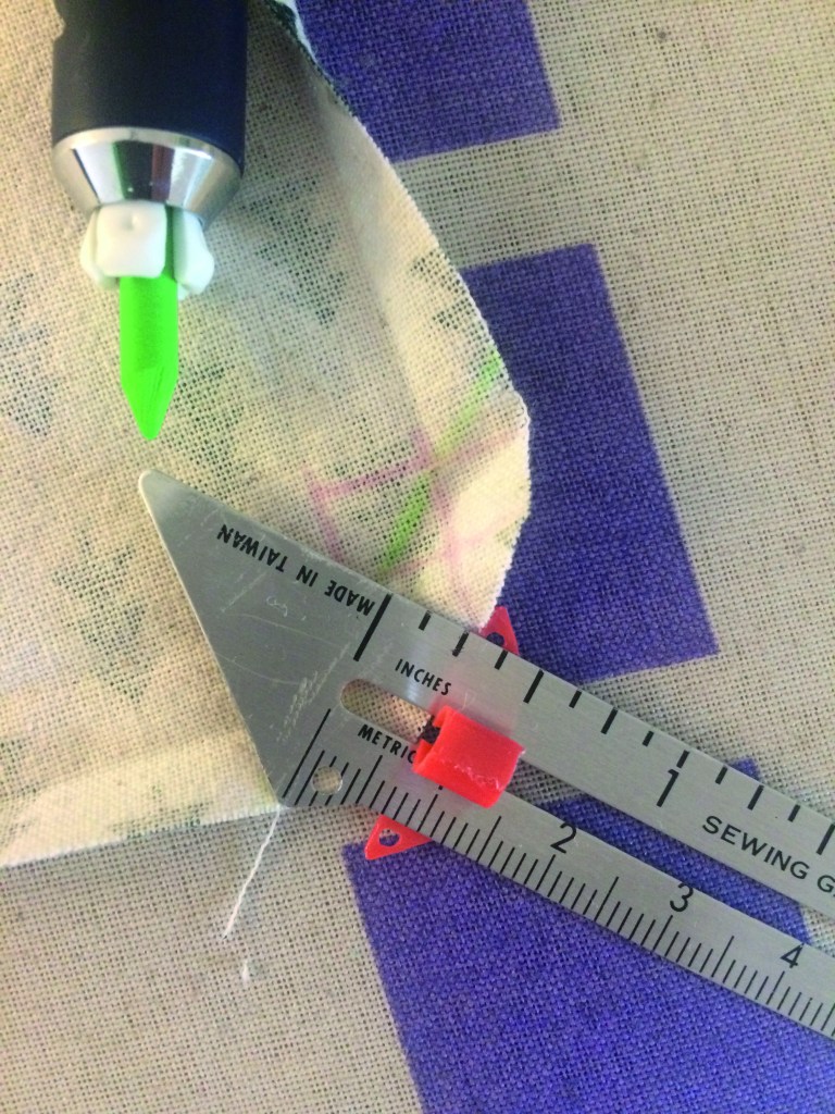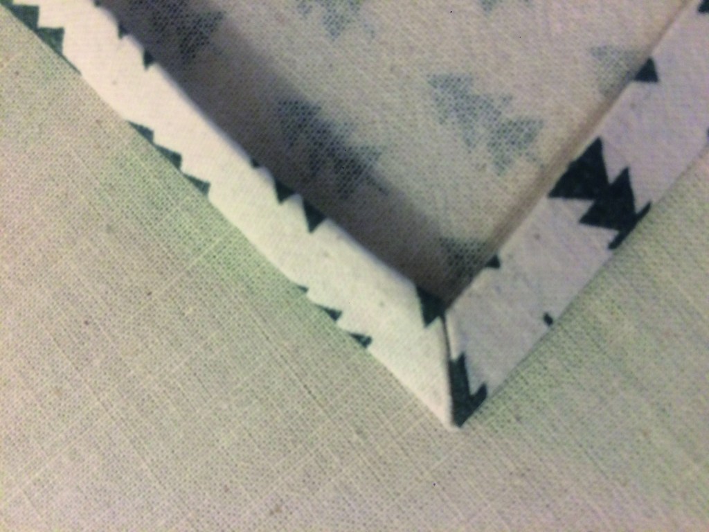 Using the pressing marks as a guide, snip the corners off on the diagonal (along the green chalk line).